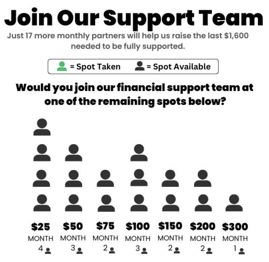 Yet, as many of you know, our monthly financial support has been strained since July 2022. We’ve sought fundraising coaching, reduced expenses, cut projects, spoken with our leaders, and streamlined both ministry and personal budgets. Just as the gap was beginning to close, our mission organization, WorldVenture, shifted its assessment fee from a flat fee to 13% of contributions– dropping our support back to 88% of budget.